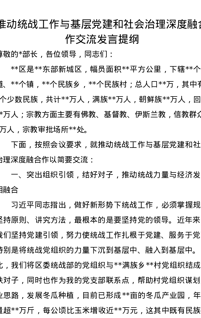 推动统战工作与基层党建和社会治理深度融合作交流发言提纲
