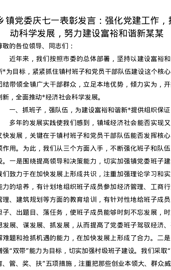 乡镇党委庆七一表彰发言:强化党建工作,推动科学发展,努力建设富裕和谐新某某