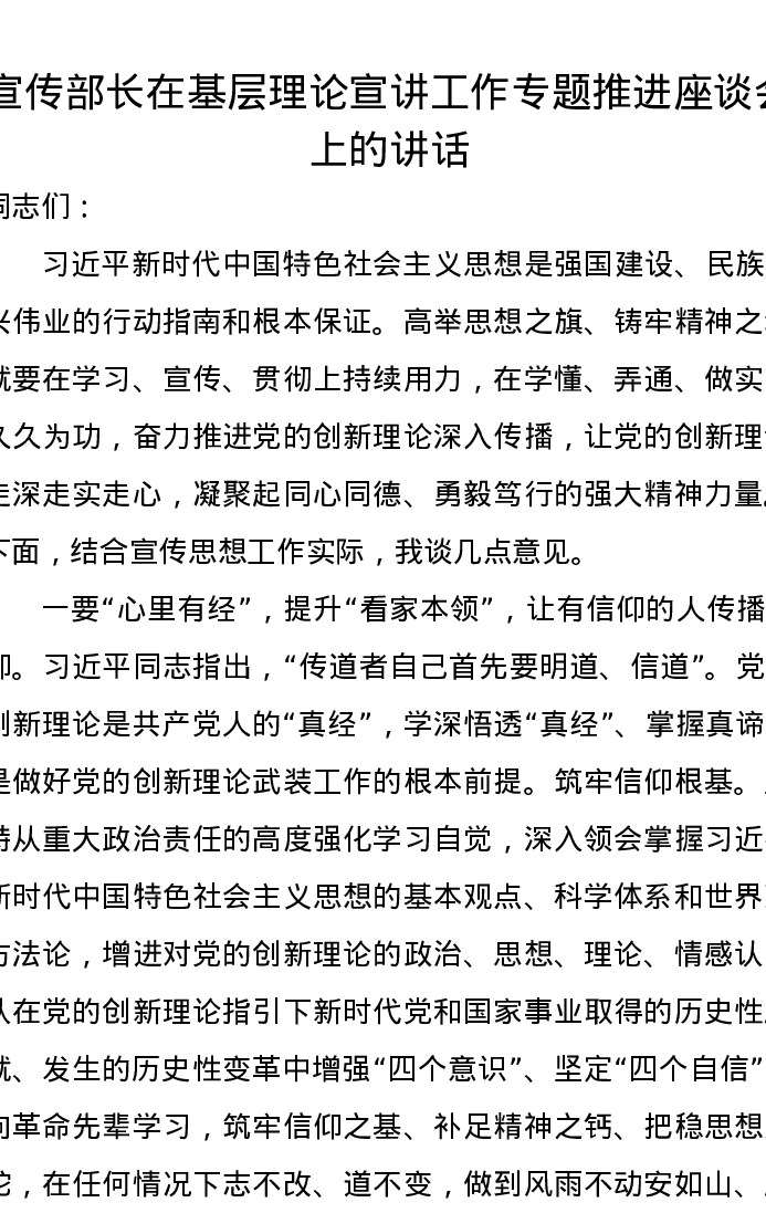 宣传部长在基层理论宣讲工作专题推进座谈会上的讲话