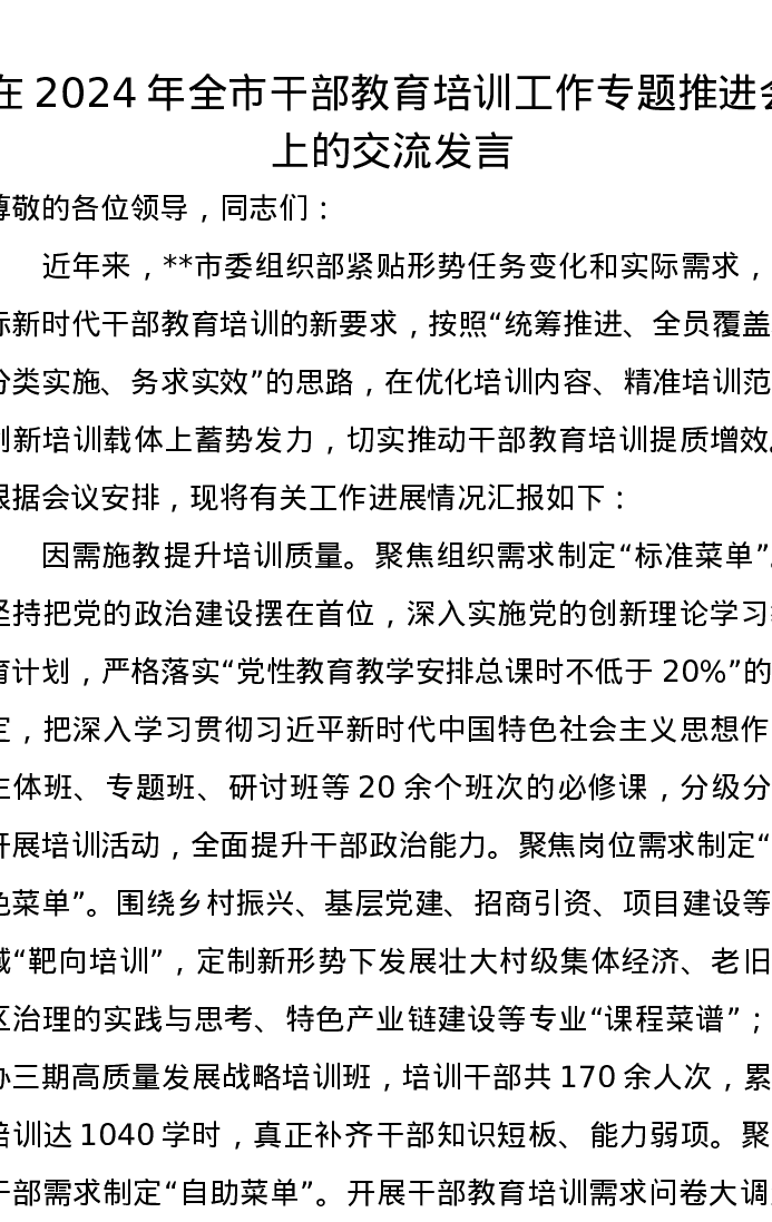 在2024年全市干部教育培训工作专题推进会上的交流发言