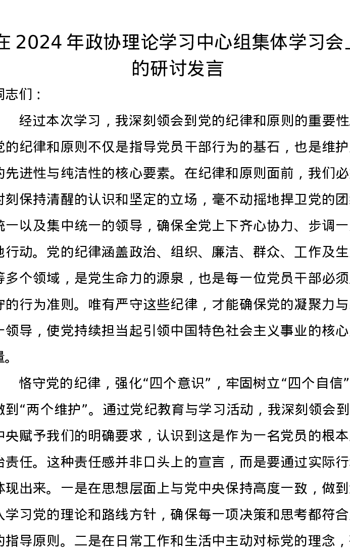 在2024年政协理论学习中心组集体学习会上的研讨发言