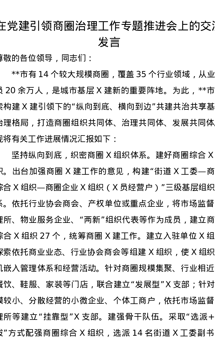 在党建引领商圈治理工作专题推进会上的交流发言