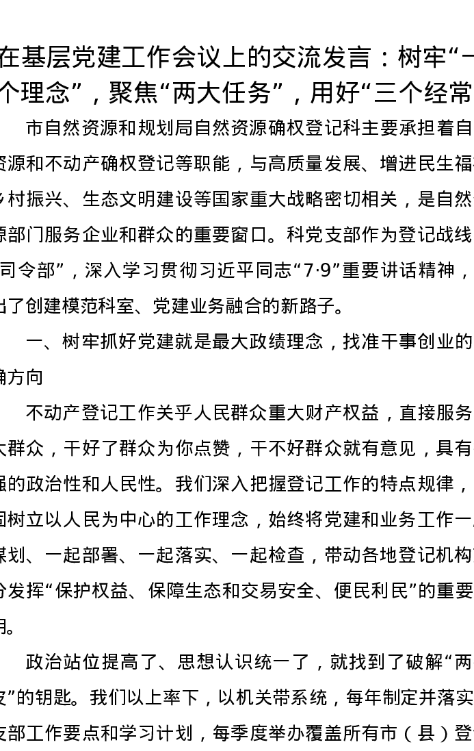 在基层党建工作会议上的交流发言:树牢“一个理念”,聚焦“两大任务”,用好“三个经常”