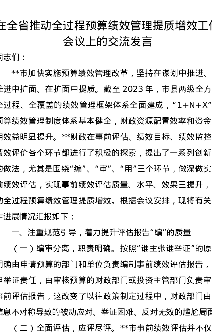 在全省推动全过程预算绩效管理提质增效工作会议上的交流发言