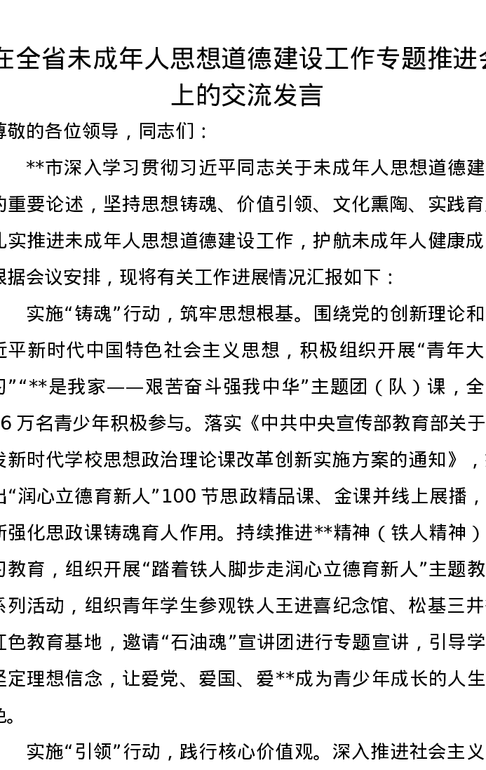 在全省未成年人思想道德建设工作专题推进会上的交流发言