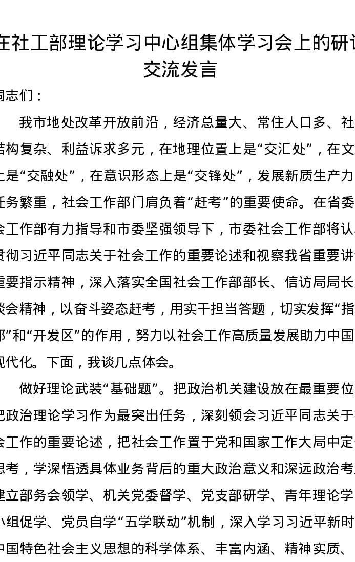 在社工部理论学习中心组集体学习会上的研讨交流发言