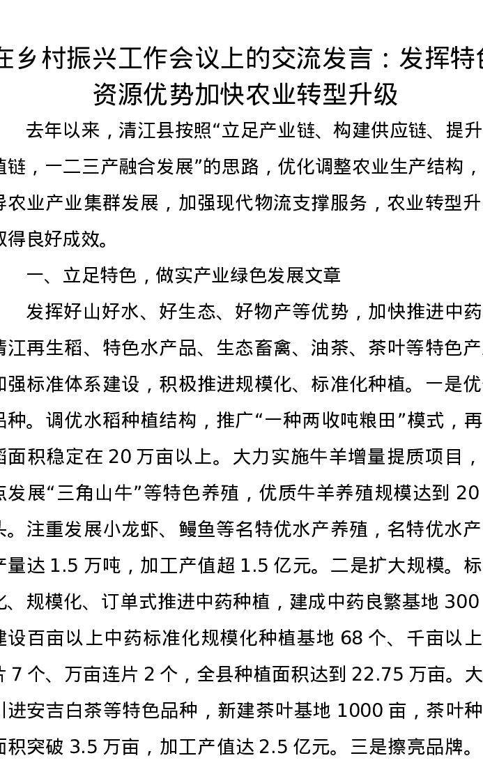 在乡村振兴工作会议上的交流发言:发挥特色资源优势加快农业转型升级