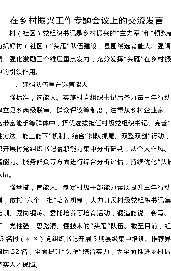在乡村振兴工作专题会议上的交流发言