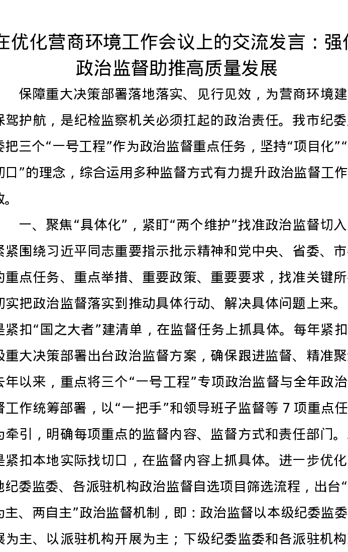 在优化营商环境工作会议上的交流发言:强化政治监督助推高质量发展