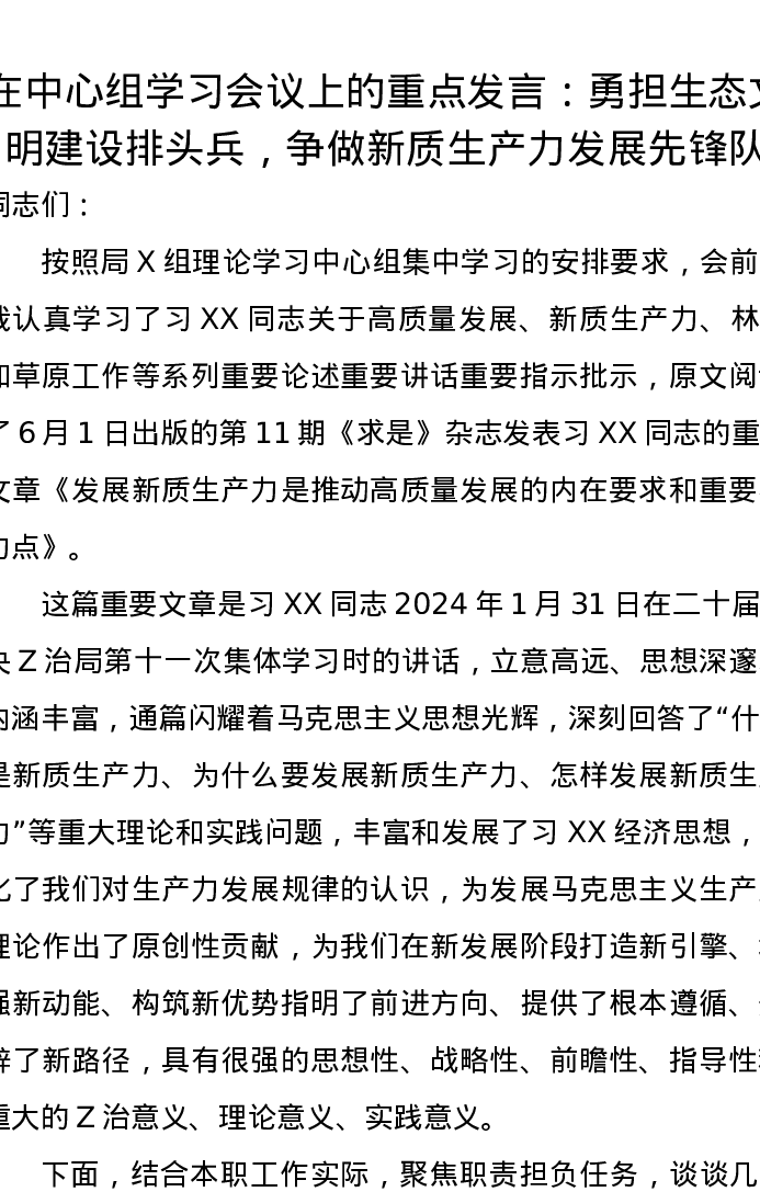在中心组学习会议上的重点发言:勇担生态文明建设排头兵,争做新质生产力发展先锋队