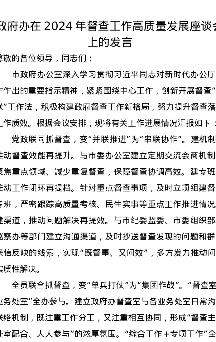 政府办在2024年督查工作高质量发展座谈会上的发言