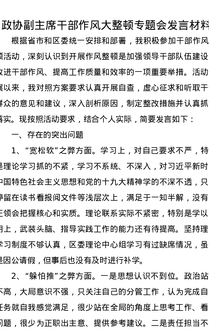 政协副主席干部作风大整顿专题会发言材料