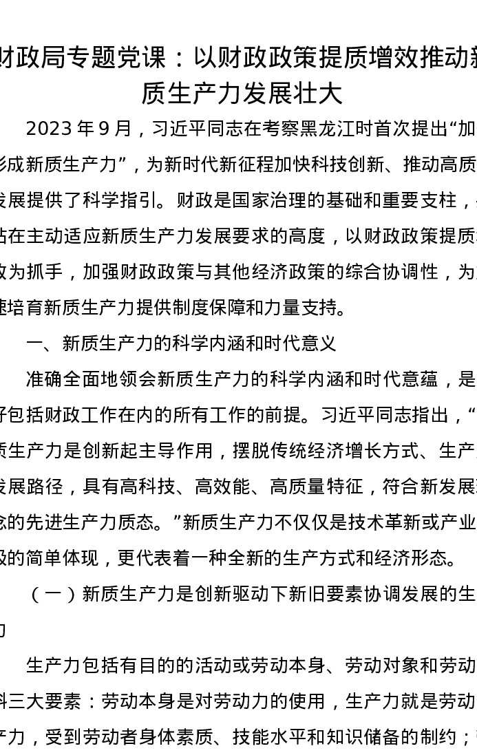 财政局专题党课:以财政政策提质增效推动新质生产力发展壮大