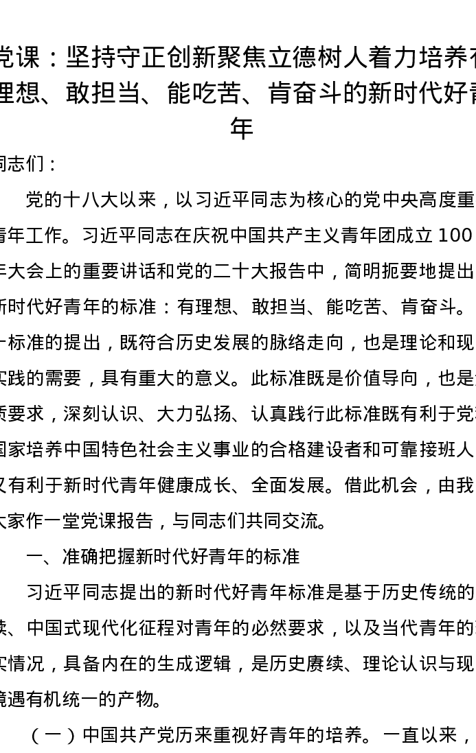 党课:坚持守正创新聚焦立德树人着力培养有理想、敢担当、能吃苦、肯奋斗的新时代好青年
