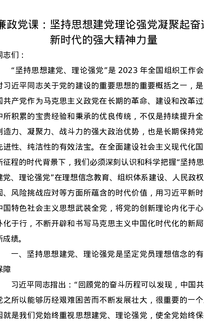 廉政党课:坚持思想建党理论强党凝聚起奋进新时代的强大精神力量
