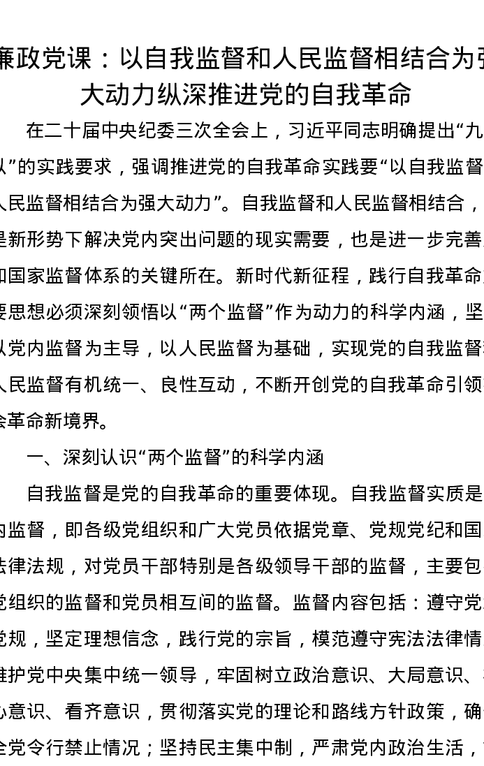 廉政党课讲稿:以自我监督和人民监督相结合为强大动力纵深推进党的自我革命
