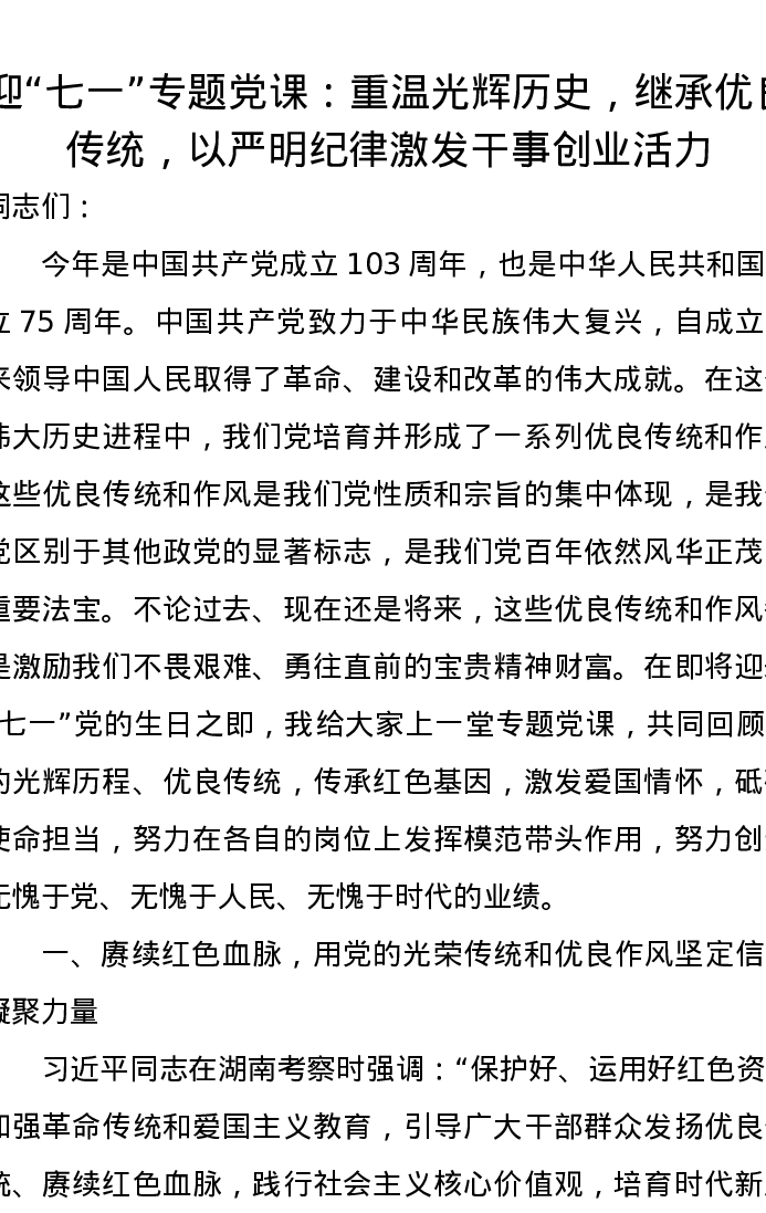 迎“七一”专题党课:重温光辉历史,继承优良传统,以严明纪律激发干事创业活力