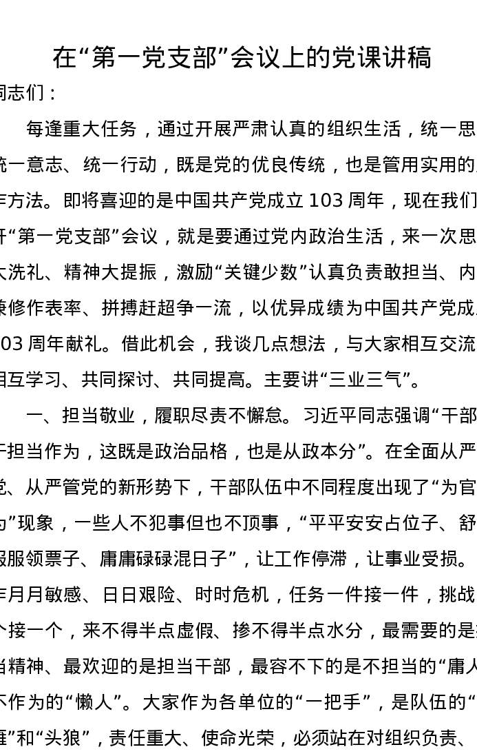 在“第一党支部”会议上的党课讲稿