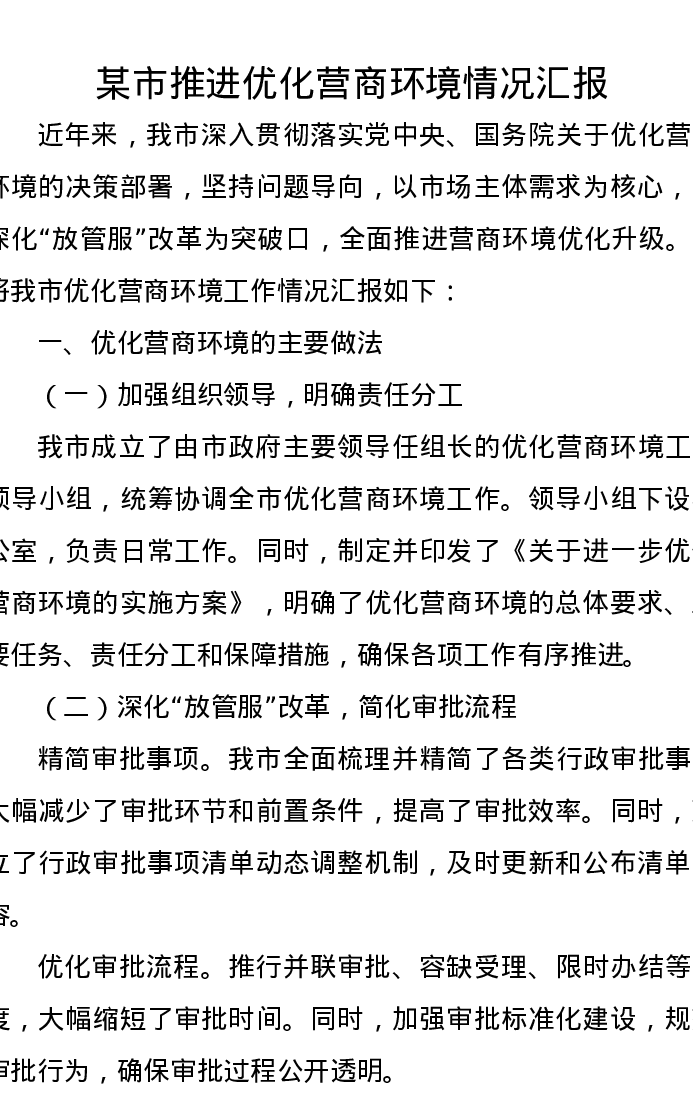 某市推进优化营商环境情况汇报