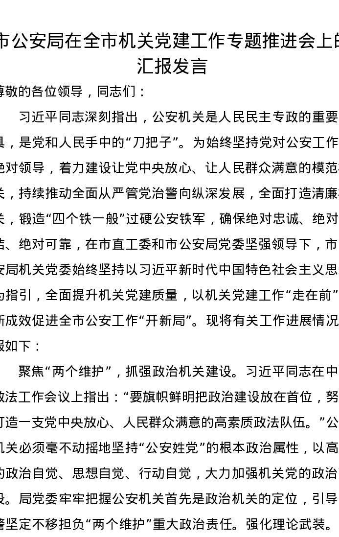 市公安局在全市机关党建工作专题推进会上的汇报发言