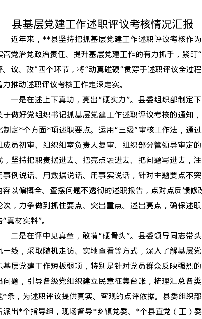 县基层党建工作述职评议考核情况汇报