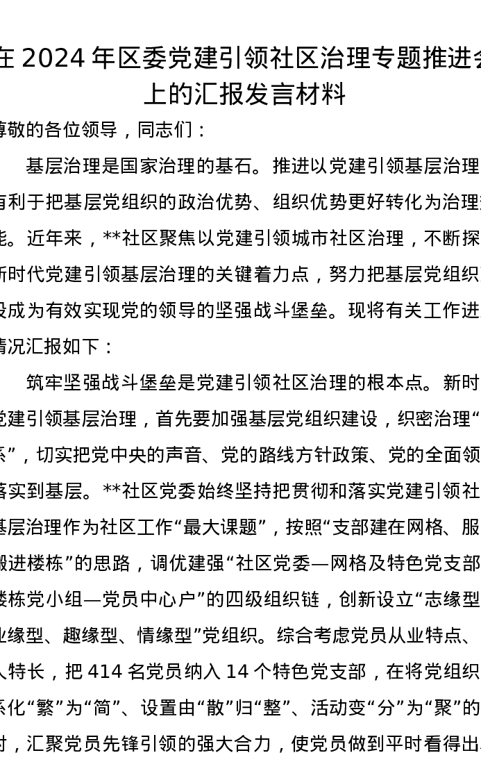 在2024年区委党建引领社区治理专题推进会上的汇报发言材料
