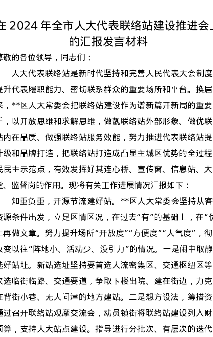 在2024年全市人大代表联络站建设推进会上的汇报发言材料