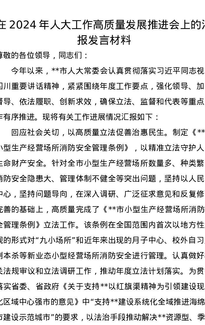 在2024年人大工作高质量发展推进会上的汇报发言材料