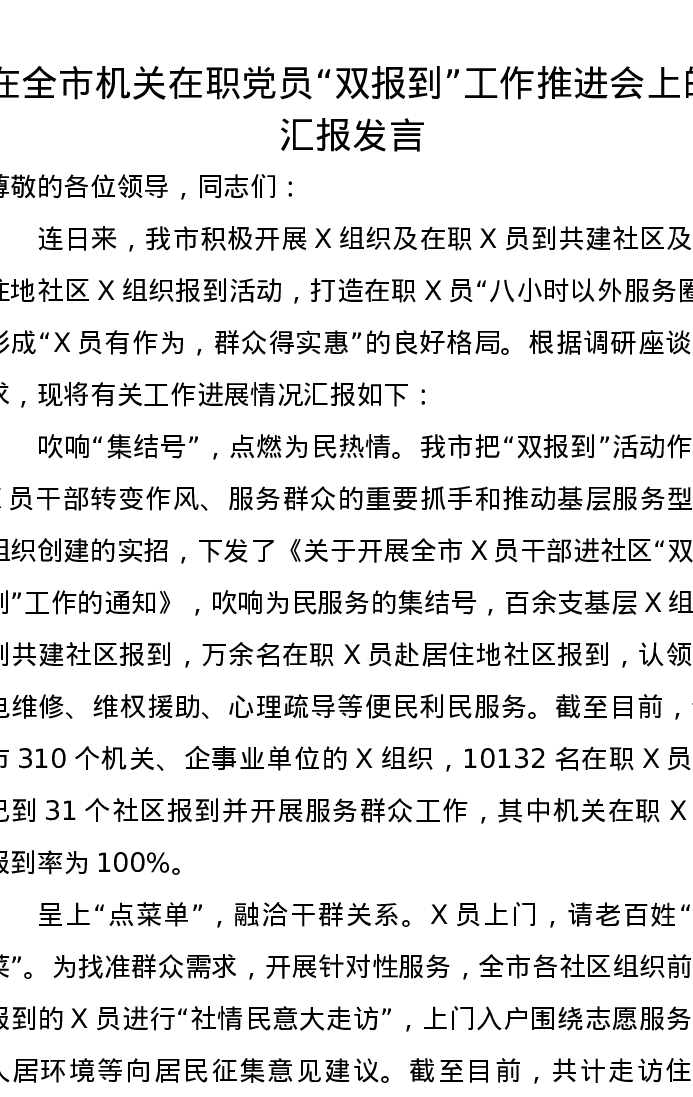在全市机关在职党员“双报到”工作推进会上的汇报发言