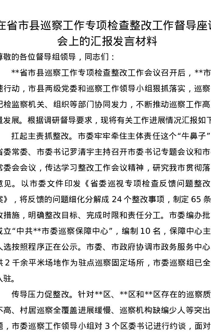 在省市县巡察工作专项检查整改工作督导座谈会上的汇报发言材料