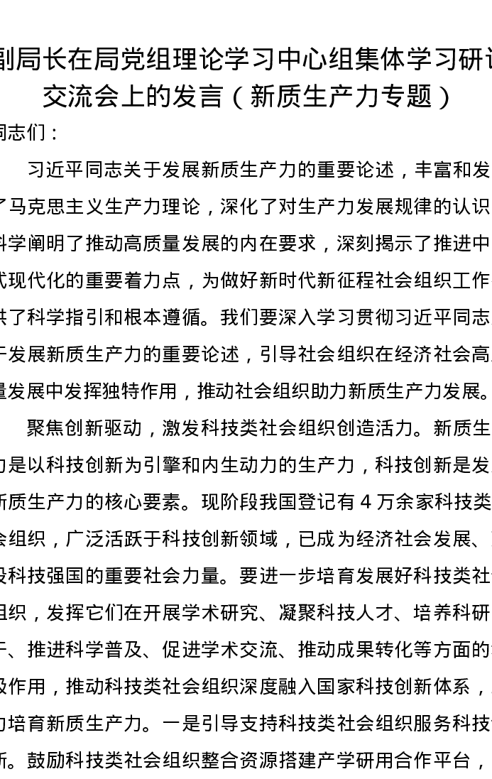 副局长在局党组理论学习中心组集体学习研讨交流会上的发言(新质生产力专题)