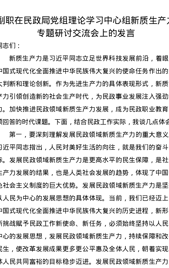 副职在民政局党组理论学习中心组新质生产力专题研讨交流会上的发言
