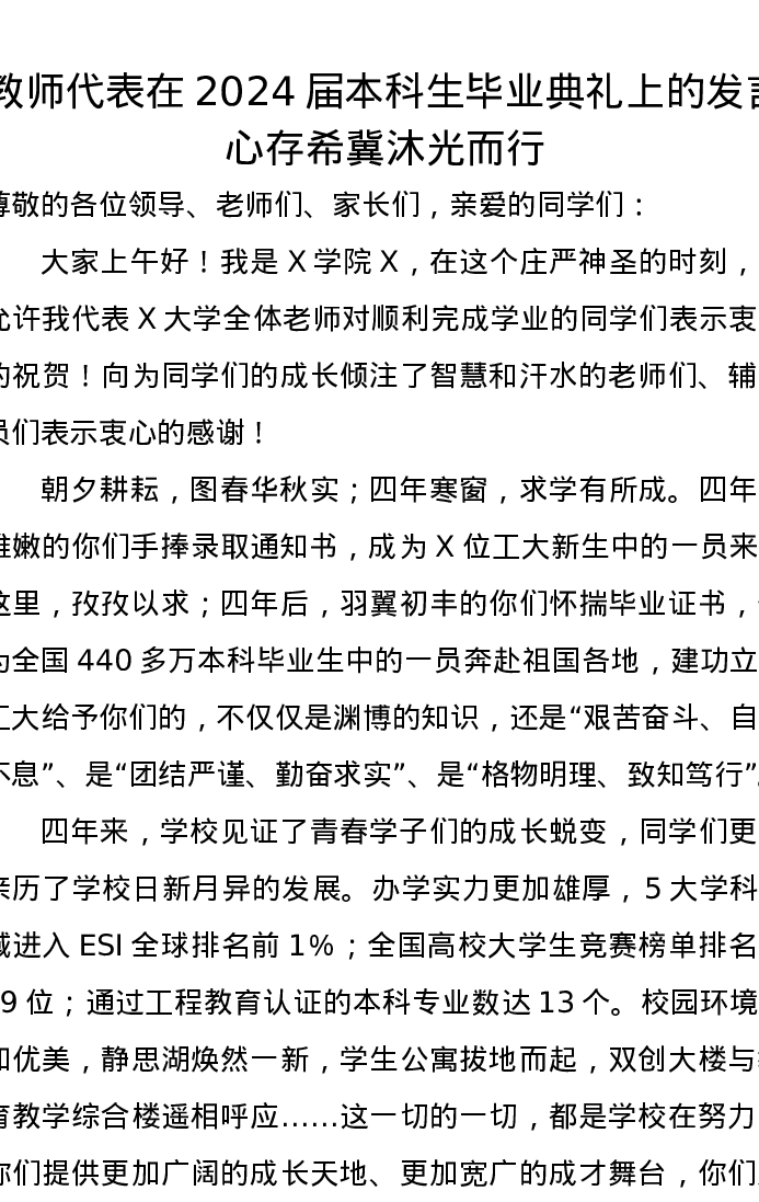 教师代表在2024届本科生毕业典礼上的发言:心存希冀沐光而行
