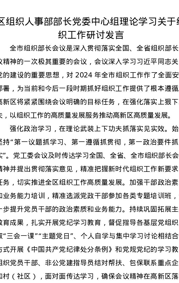 区组织人事部部长党委中心组理论学习关于组织工作研讨发言
