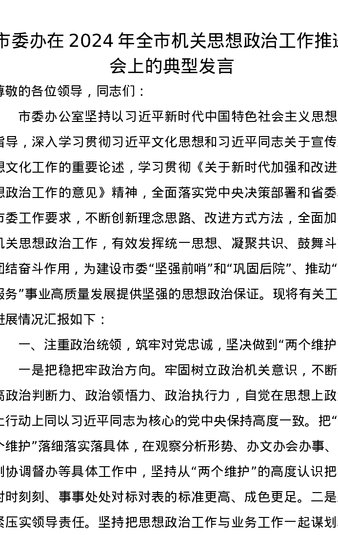 市委办在2024年全市机关思想政治工作推进会上的典型发言