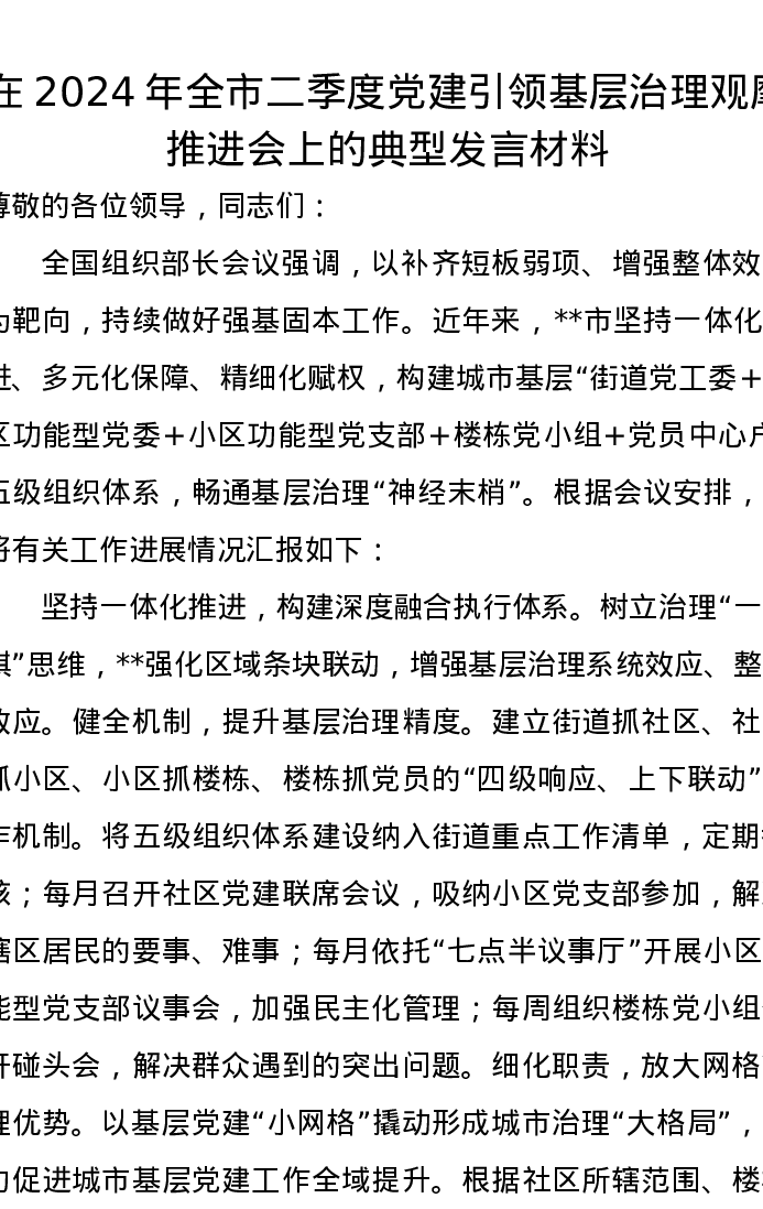 在2024年全市二季度党建引领基层治理观摩推进会上的典型发言材料