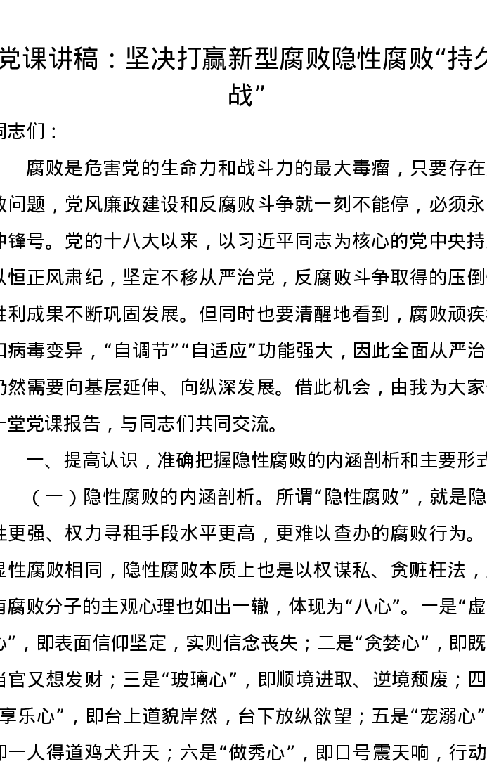 党课讲稿:坚决打赢新型腐败隐性腐败“持久战”