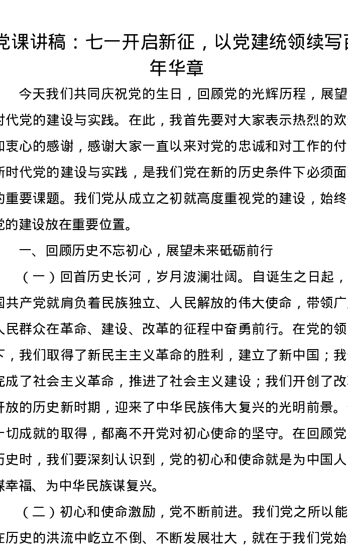 党课讲稿:七一开启新征,以党建统领续写百年华章