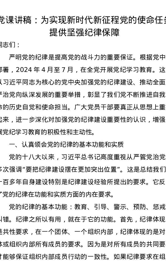 党课讲稿:为实现新时代新征程党的使命任务提供坚强纪律保障