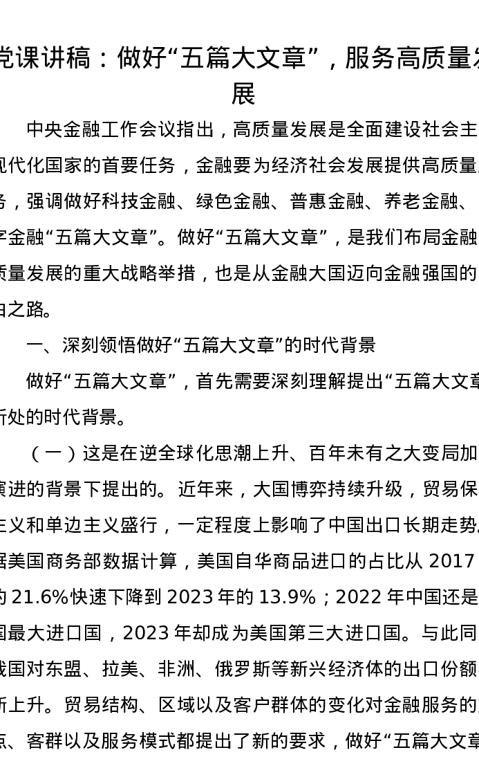 党课讲稿:做好“五篇大文章”,服务高质量发展