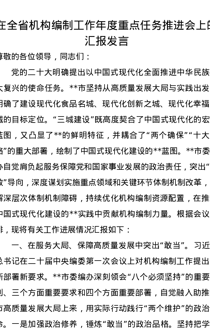 在全省机构编制工作年度重点任务推进会上的汇报发言