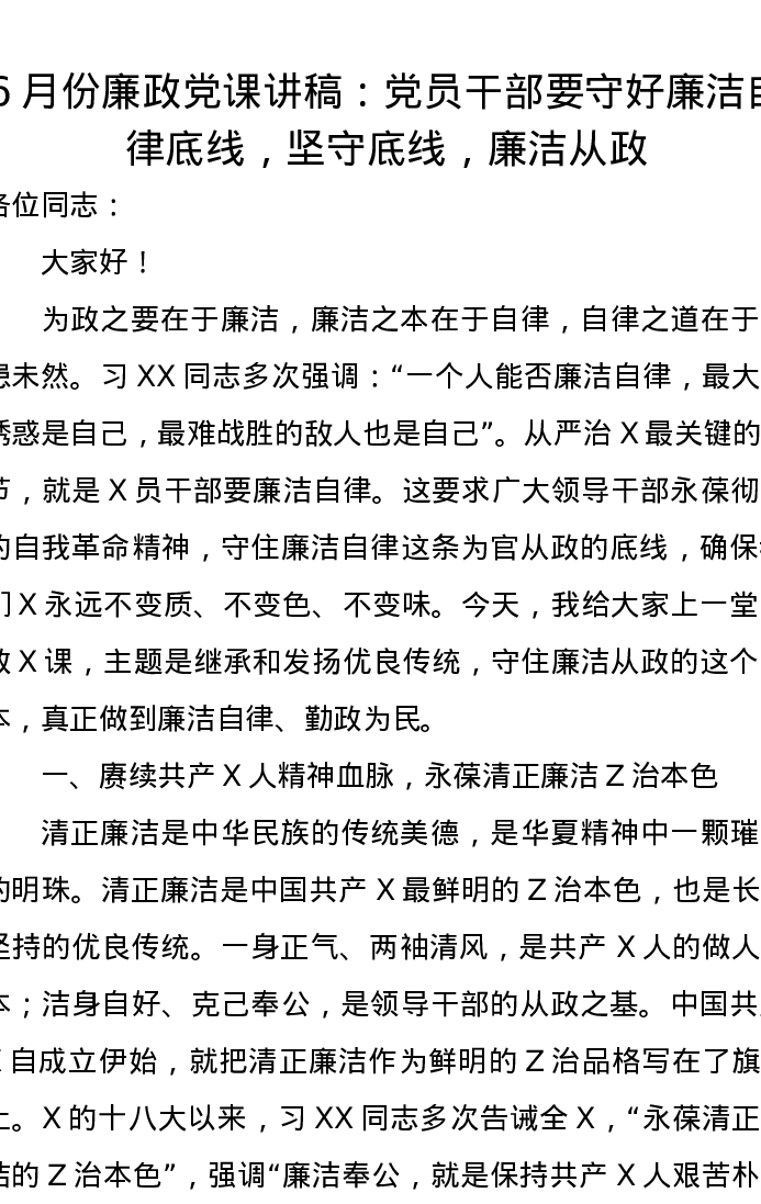 6月份廉政党课讲稿:党员干部要守好廉洁自律底线,坚守底线,廉洁从政