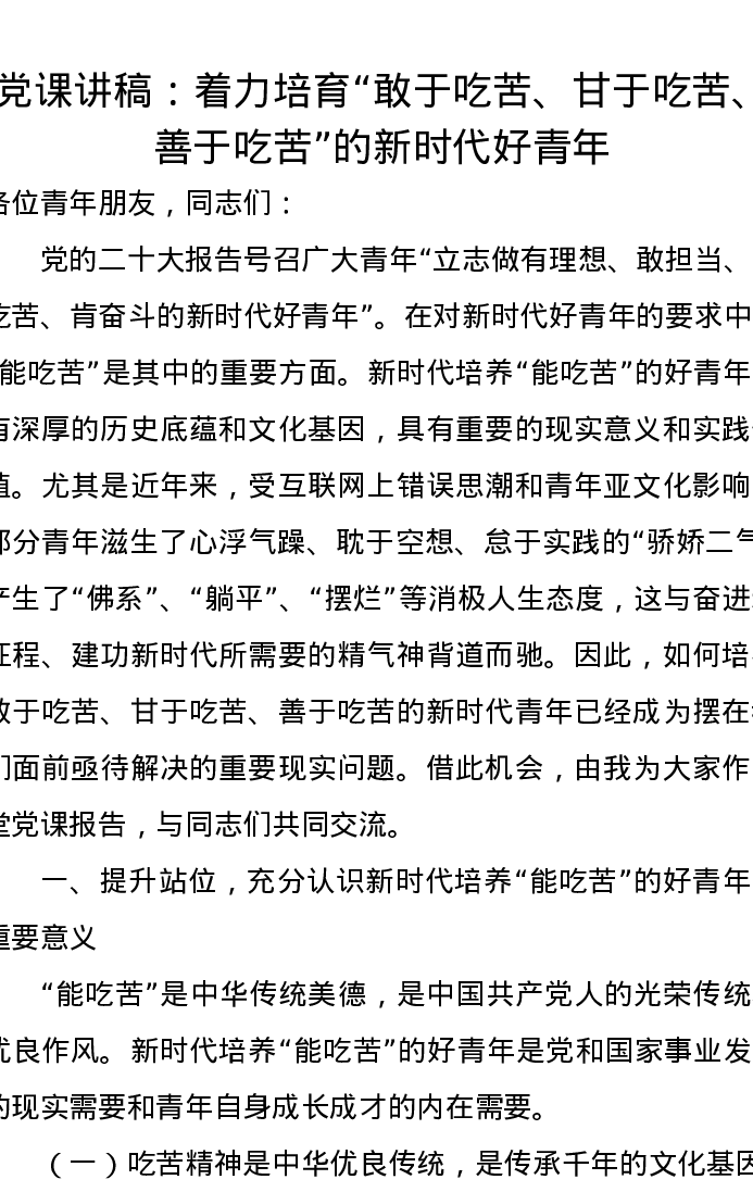 党课讲稿:着力培育“敢于吃苦、甘于吃苦、善于吃苦”的新时代好青年