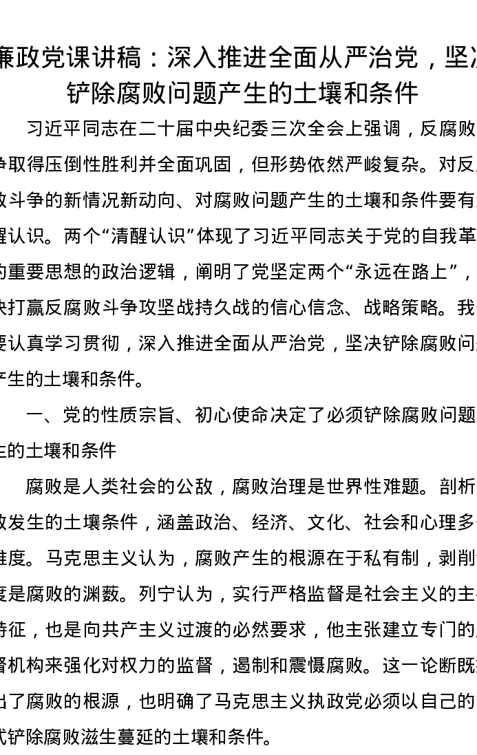 廉政党课讲稿:深入推进全面从严治党,坚决铲除腐败问题产生的土壤和条件