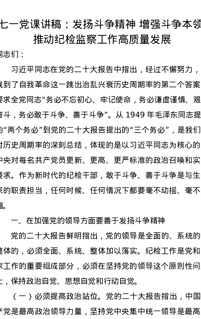 七一党课讲稿:发扬斗争精神,增强斗争本领,推动纪检监察工作高质量发展