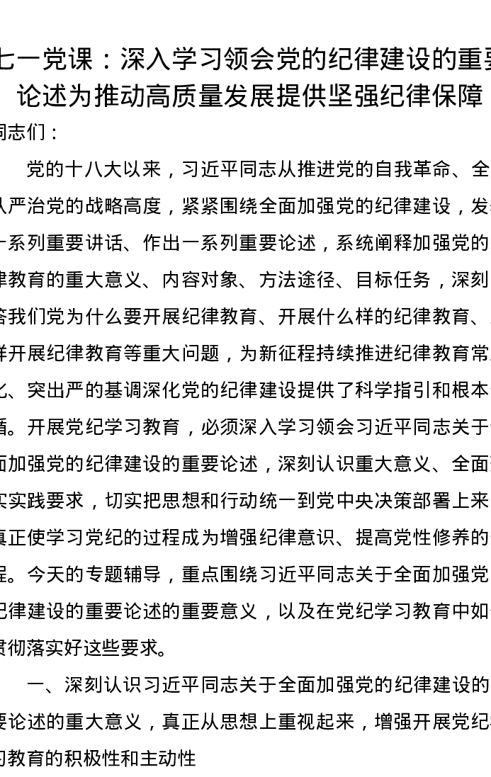 七一党课讲稿:深入学习领会党的纪律建设的重要论述为推动高质量发展提供坚强纪律保障