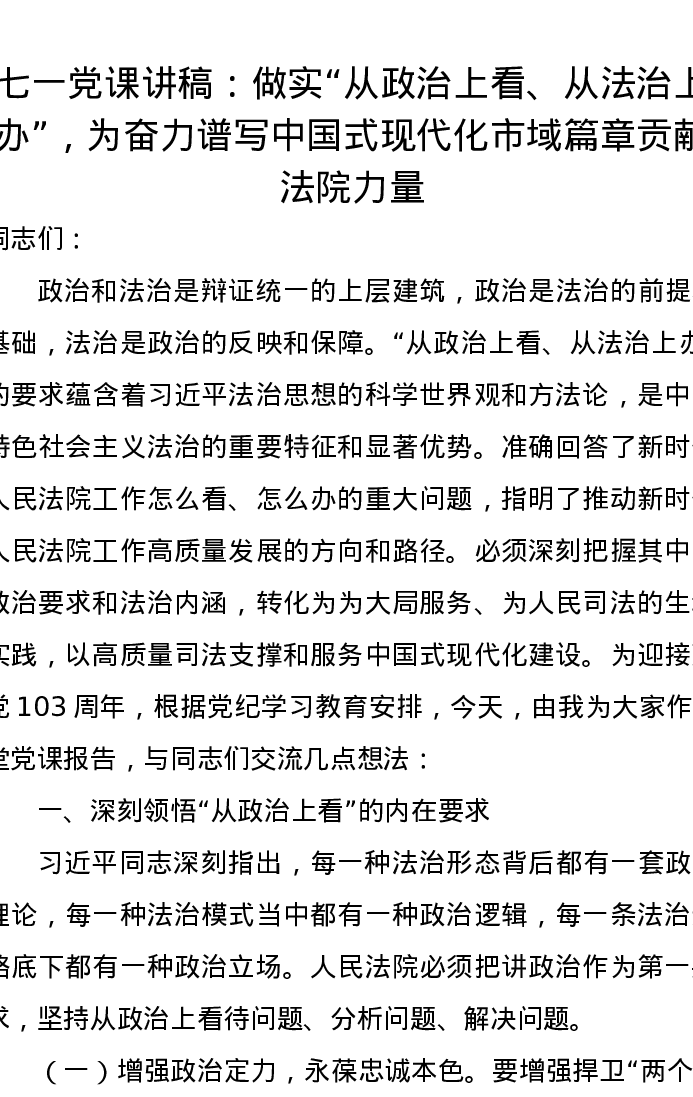 七一党课讲稿:做实“从政治上看、从法治上办”,为奋力谱写中国式现代化市域篇章贡献法院力量