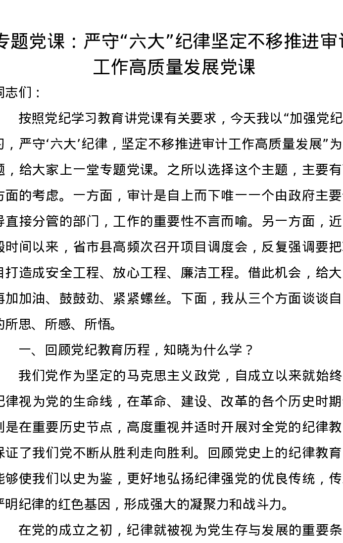 专题党课:严守“六大”纪律坚定不移推进审计工作高质量发展党课