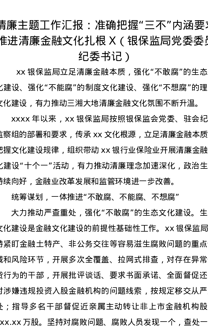 清廉主题工作汇报:准确把握“三不”内涵要求推进清廉金融文化扎根X(银保监局党委委员、纪委书记)