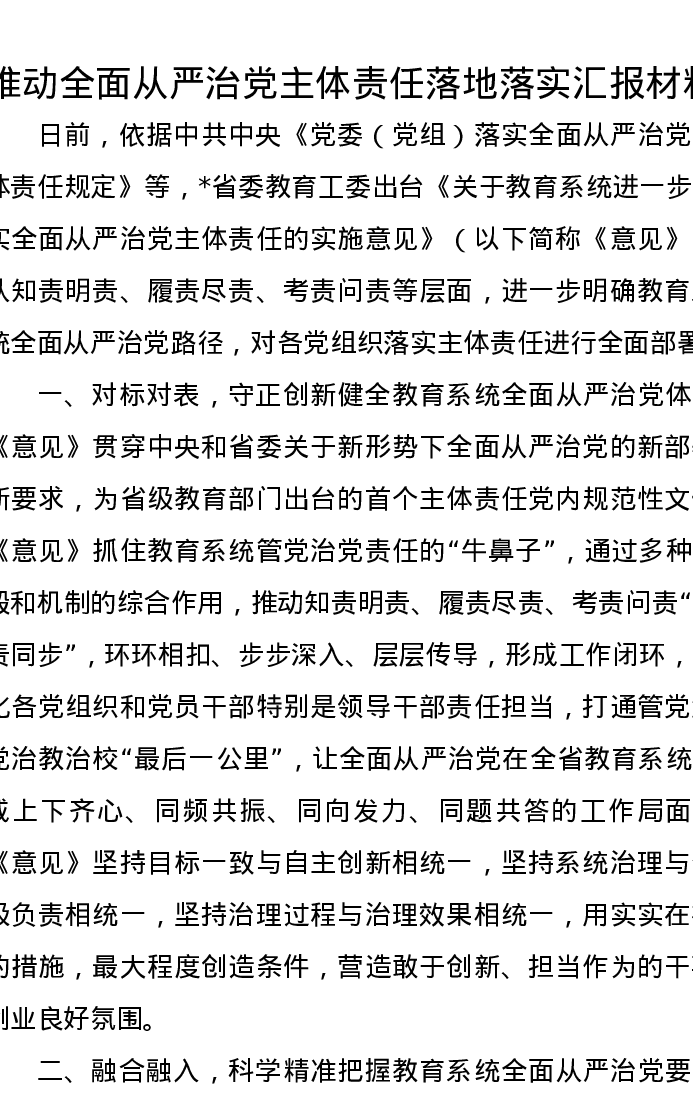推动全面从严治党主体责任落地落实汇报材料